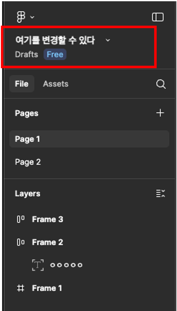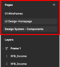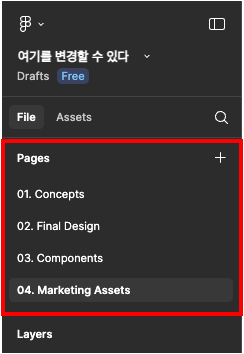 2. 페이지 이름 변경 : 페이지 이름을 더블 클릭하여 프로젝트의 목적에 맞게 변경합니다. (예 : 01.Wireframes, UI Design-Homepage, Design System - Components)