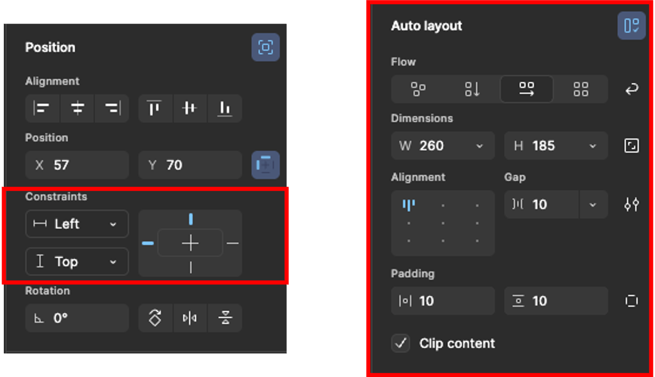 - Clipping (Clip content) : 이 옵션을 활성화하면 프레임 경계를 벗어나는 자식 요소들이 보이지 않도록 잘라냅니다. 스크롤 가능한 콘텐츠를 디자인할 때 유용하며, 기본적으로 활성화되어 있습니다.