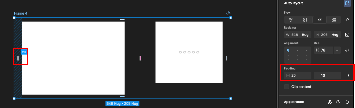 - Horizontal padding (수평 패딩) : 오토 레이아웃 프레임의 좌우 내부 여백을 조절합니다.