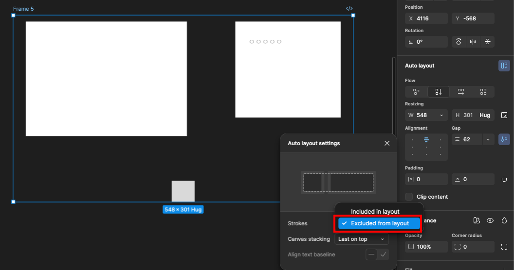 - (오토 레이아웃 Reizing은 아니지만 관련하여 함께 설명) 오토 레이아웃 프레임 내에서 특정 자식 요소만 오토 레이아웃의 흐름에서 벗어나 고정된 위체에 있고 싶을 때 사용합니다. Position 우측 lgnore auto layout버튼 클릭