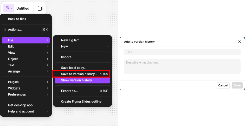 - 사용법 : 상단 메인 메뉴(Figma아이콘) > File > Save to version History를 클릭합니다.