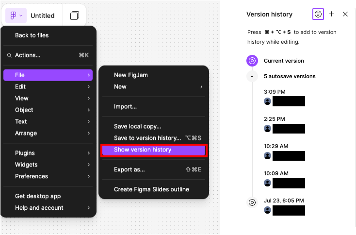 1. 접근 방법 : 상단 메인 메뉴(Figma 아이콘) > File > Show version history를 클릭합니다.