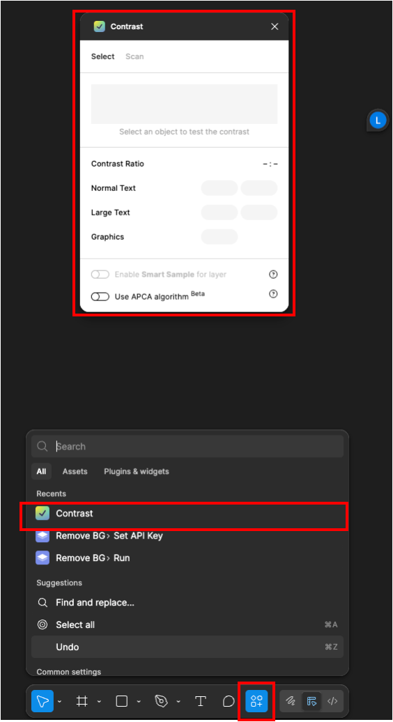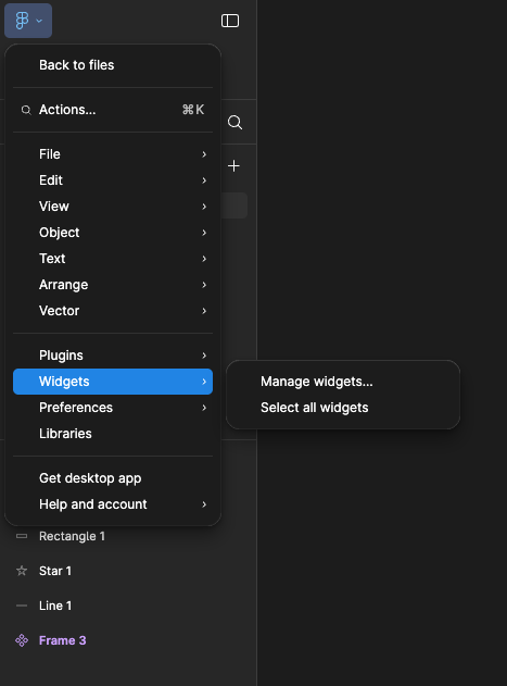 - Figma 앱 내에서 좌측 패널의 Widgets탭을 클릭하거나, 상단 메뉴바의 Widgets > Find more widgets를 선택합니다.
