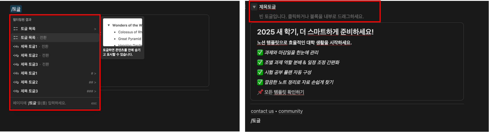 2. 토글(Toggle)블록 사용 : 슬래시(/)를 입력하고 토글을 선택하면 접었다 펼 수 있는 목록이 생성됩니다 많은 양의 정보를 깔끔하게 숨기거나 보여줄 수 있어 페이지가 훨씬 정돈되어 보입니다.