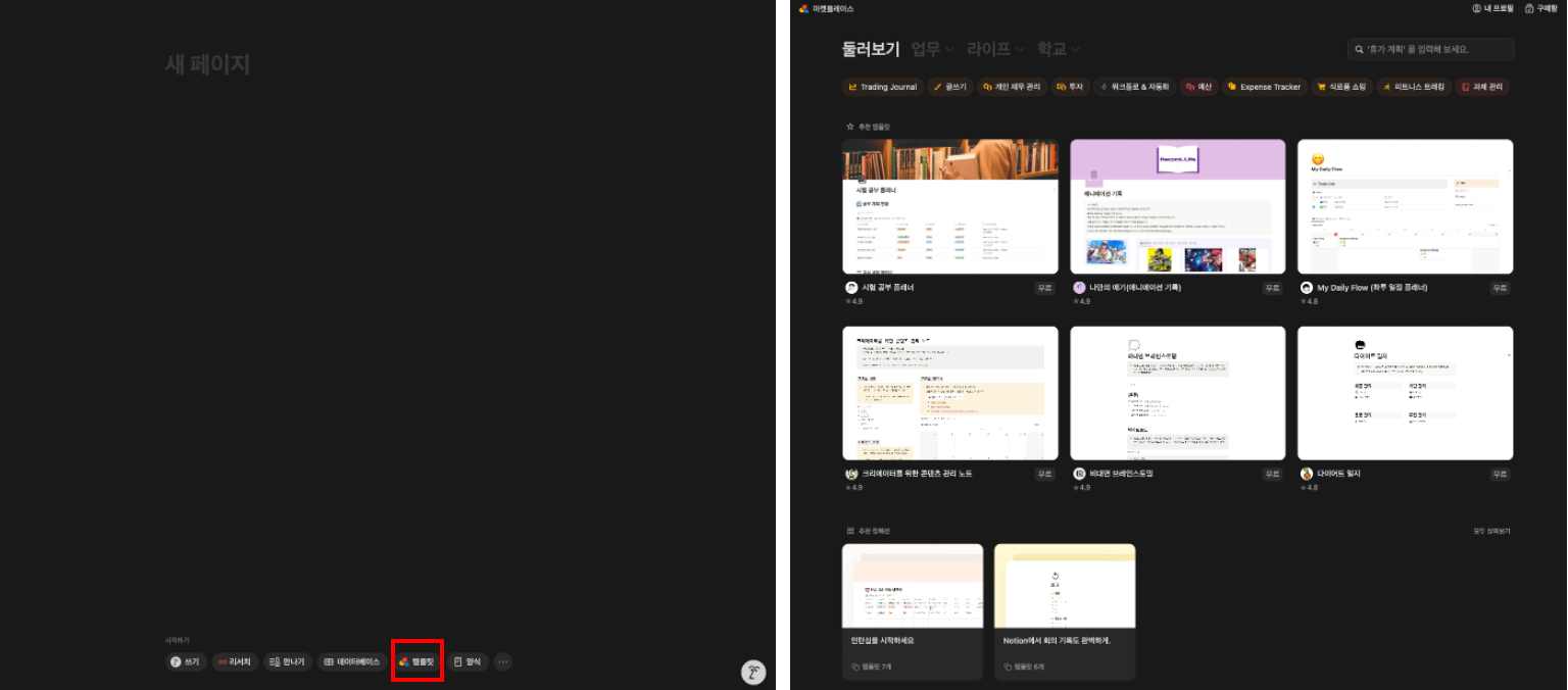 1. 템플릿 갤러리 열기 : 새 페이지를 만들 때, 템플릿 버튼을 클릭하거나, 왼쪽 사이드바에서 +새 페이지를 누르고 템플릿을 선택합니다.