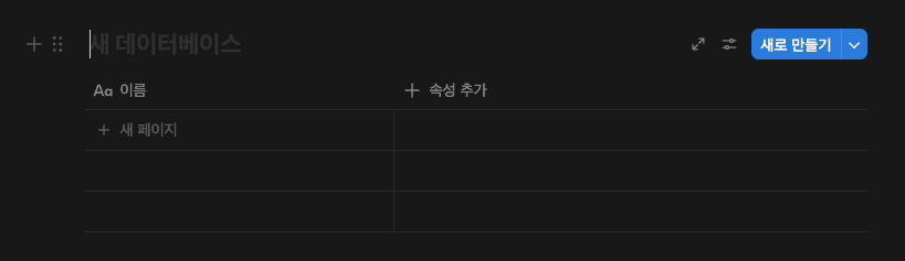 - 전체 페이지(Full page) 데이터베이스 : 페이지 전체를 데이터베이스로 사용하는 형태입니다. 다른 블록을 추가할 수 없어 오직 데이터 베이스 관리만을 위한 전용 페이지로 활용됩니다.