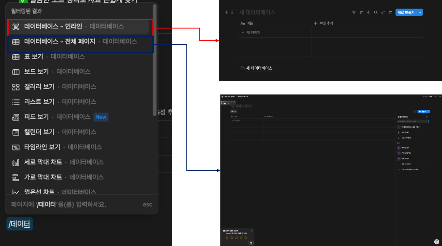 - 인라인(Inline) 데이터베이스 : 기존 페이지 안에 데이터베이스가 삽입된 형태입니다. 데이터베이스 위아래로 다른 블록(텍스트, 이미지 등)을 배치할 수 있어, 페이지의 일부처럼 활용하기 좋습니다.