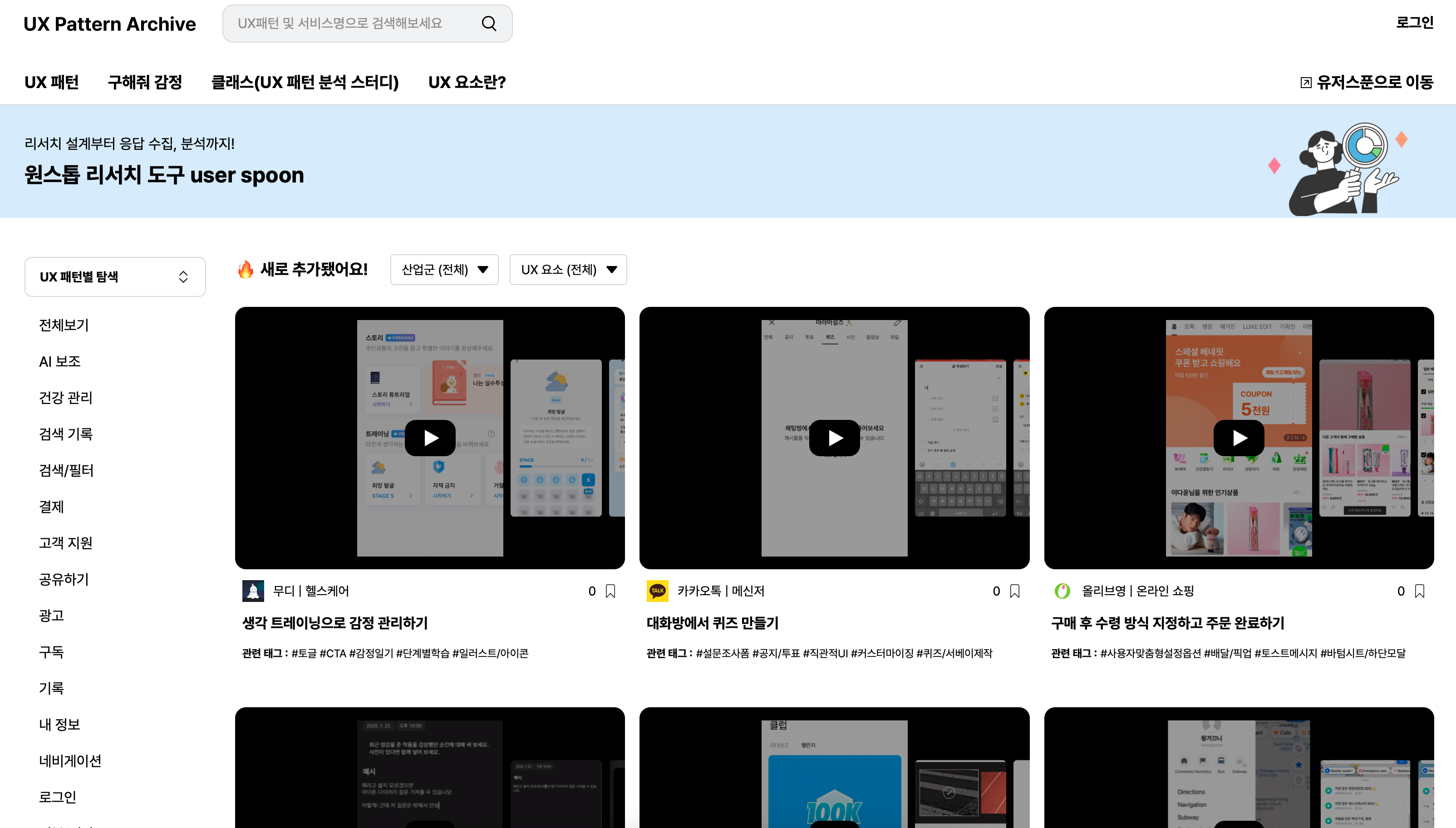 모바일 앱 위주로 정리된 사이트인데, 앱 디자인 할때는 이만한게 없습니다. 카테고리도 깔끔하게 나눠져 있어서 특정 기능별 패턴 찾기에도 편리했구요. 해외 에서 유명한 Mobbin(모빈)사이트랑 비슷한데, 한국어로도 잘 정리되어 있어서 접근하기 편리합니다. 저처럼 앱 UI를 자주 만지는 분들에게 완전 꿀템 사이트!