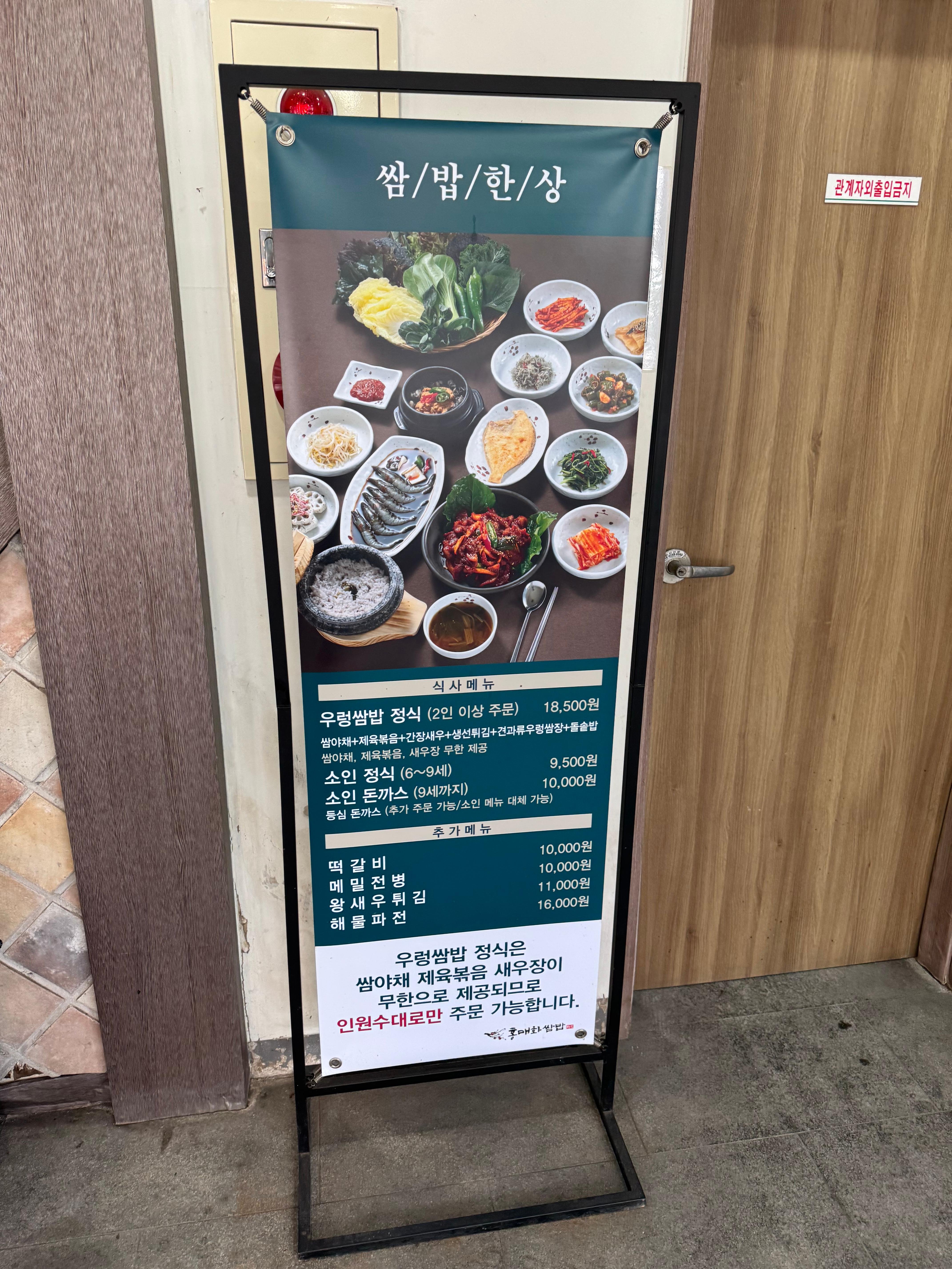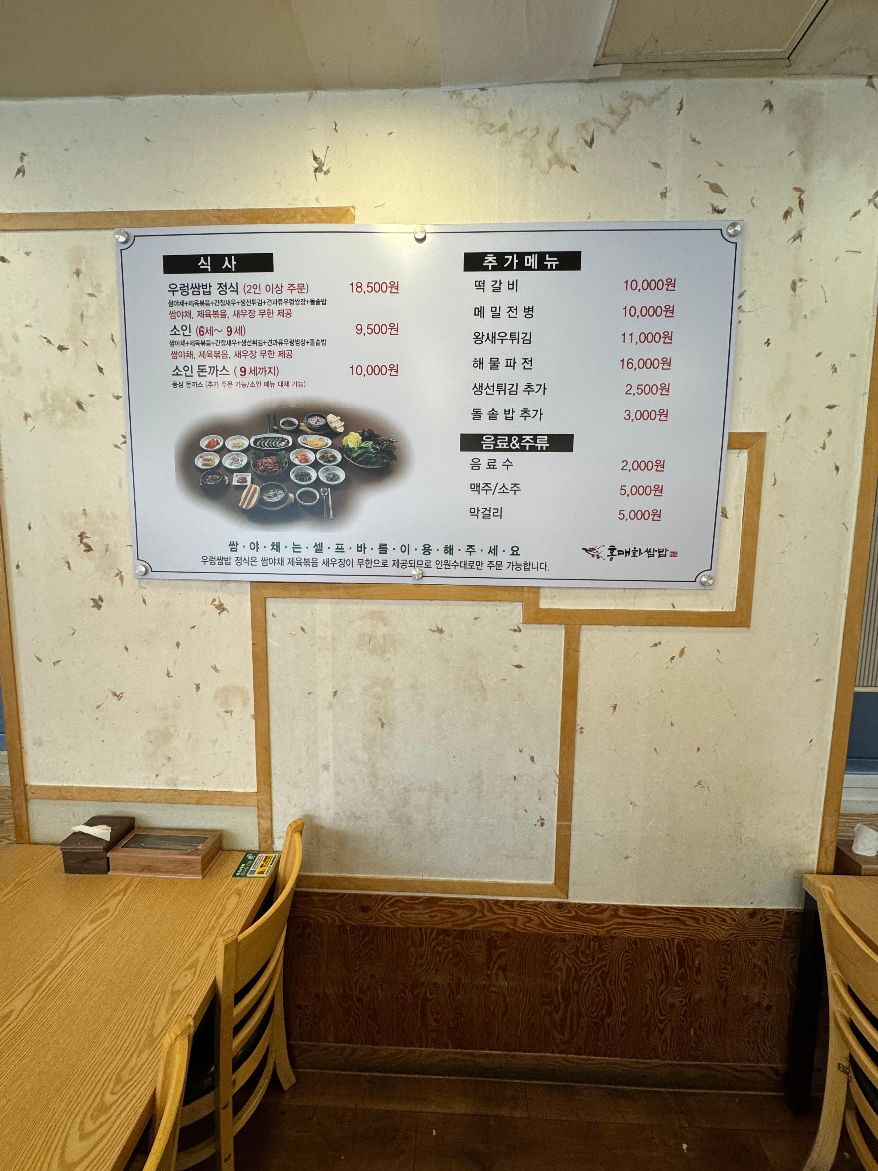 매화쌈밥에 도착하자마자 메뉴판을 봤는데요, 사실 고민할 게 별로 없더라구요. 기본이 우렁쌈밥 정식이라 거의 다 이걸 주문하는 분위기였어요. 사이드로 해물파전이나 전병도 있었고, 어린이용 돈가스도 준비돼 있어서 아이 있는 집은 따로 주문하기도 좋겠더라구요. 저희는 가족 단위로 갔기 때문에 고민 없이 우렁쌈밥 정식으로 통일했습니다! 메뉴가 단순해서 빨리 정할 수 있는다는 게 은근히 장점 같았어요. 괜히 여기저기 메뉴 고르다 싸움나는 일 없고 다 같이 똑같이 먹으니 화기애애했습니다.