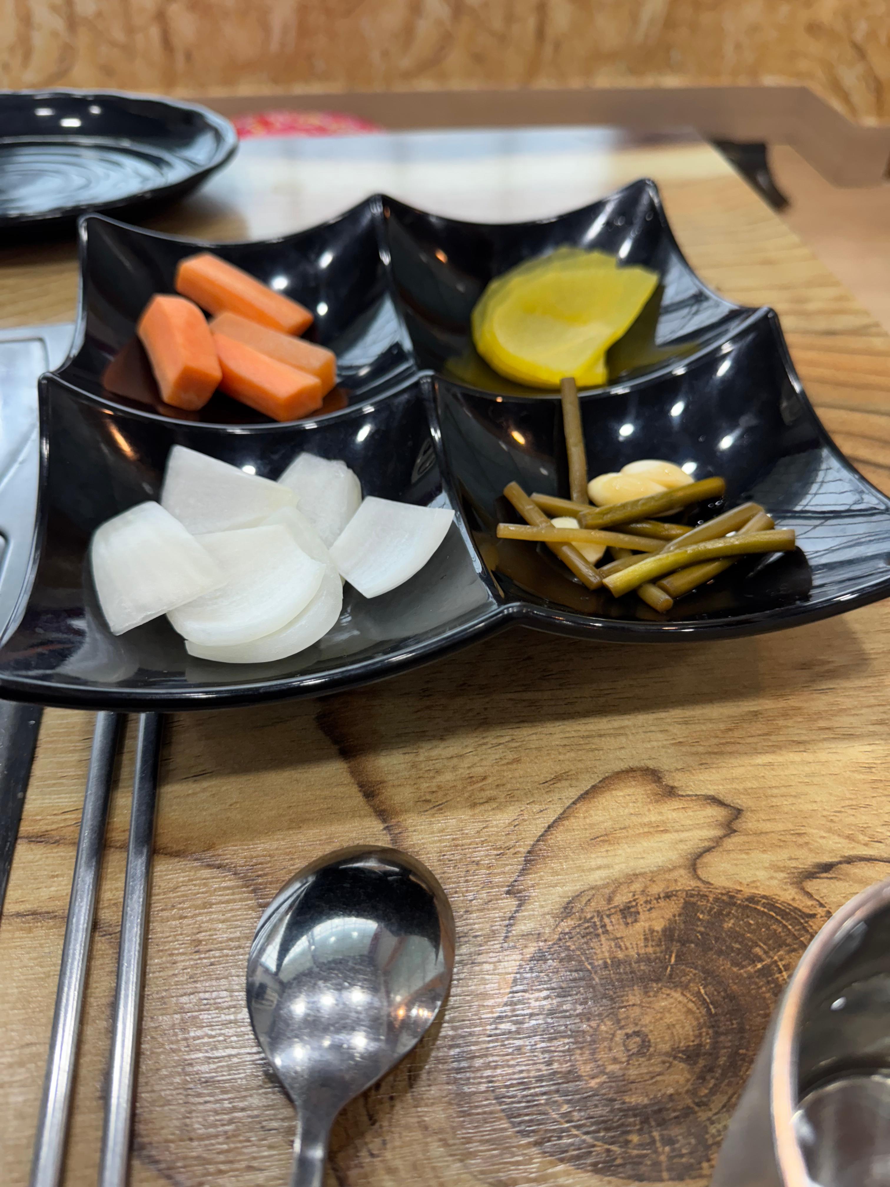 가게에 앉자마자 기본 반찬이 깔리는데, 당근, 양파, 장조림, 단무지 이렇게 딱 깔끔하게 나왔어요.