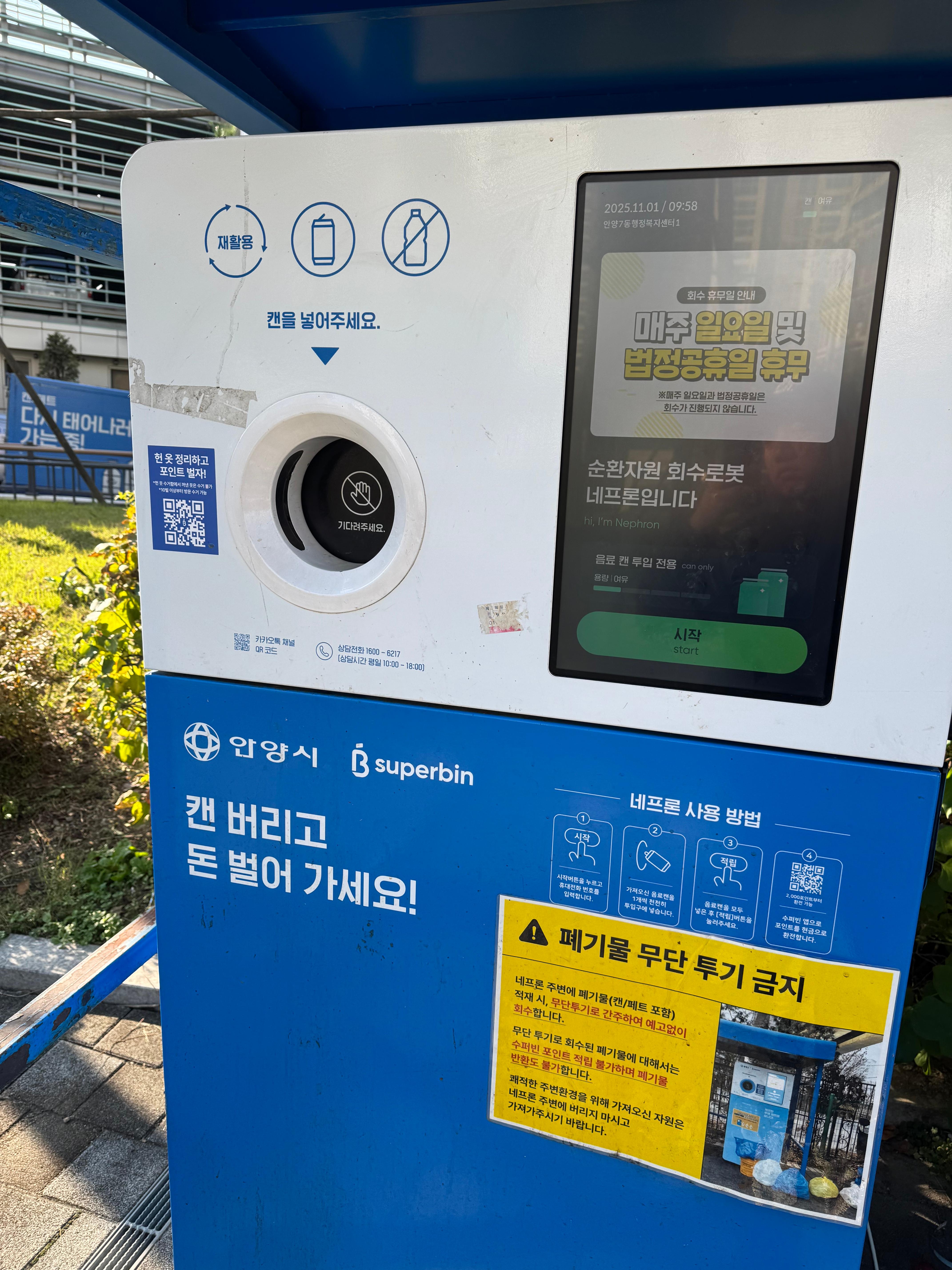 경기도 내 대부분의 시군에서 운영하는 캔/페트병 무인 회수기는 슈퍼빈(SuperBin)사의 네프론기기를 사용합니다. 이 시스템을 이용하기 위해서는 전용 앱을 사용하는 것이 필수입니다.