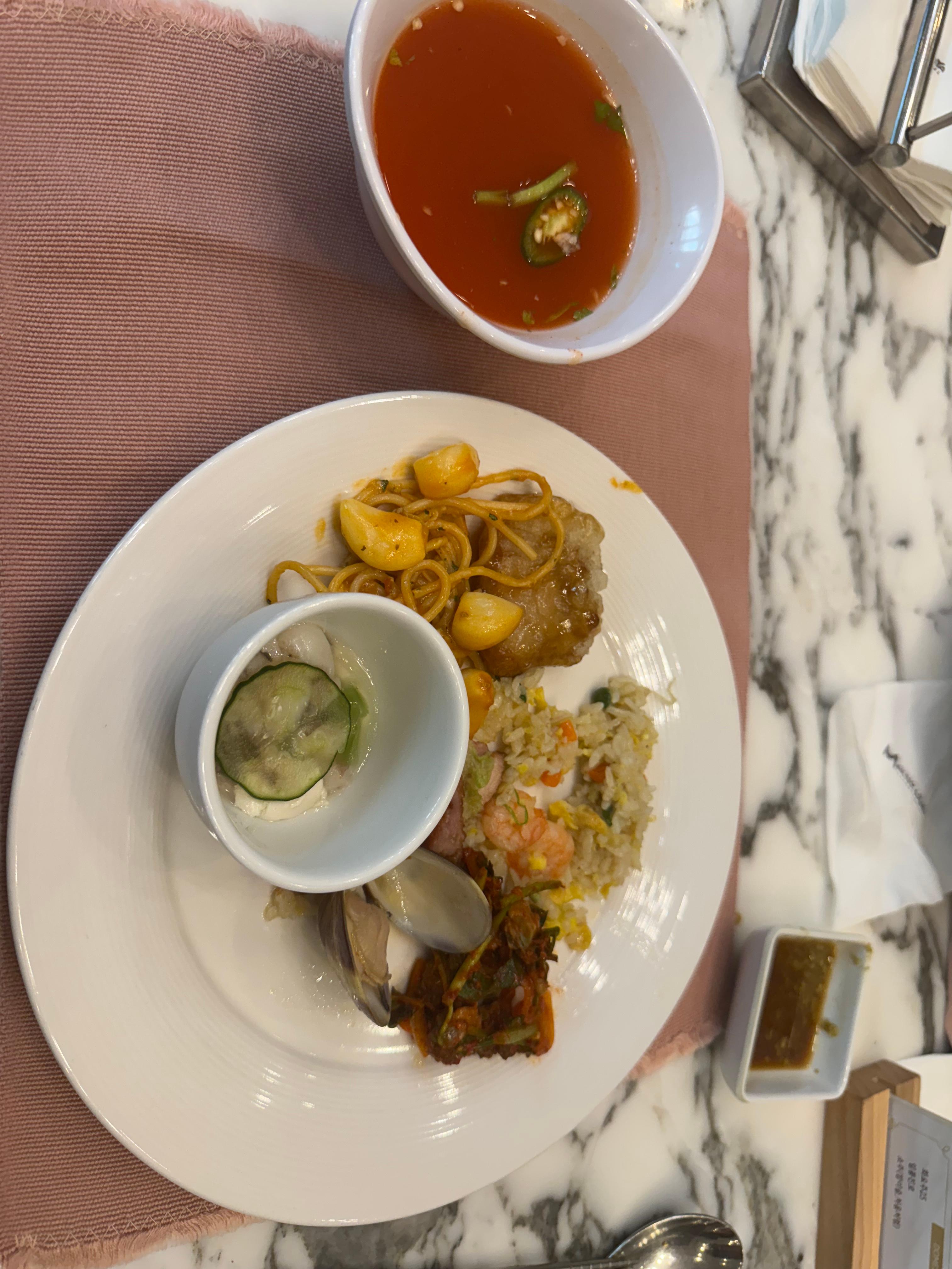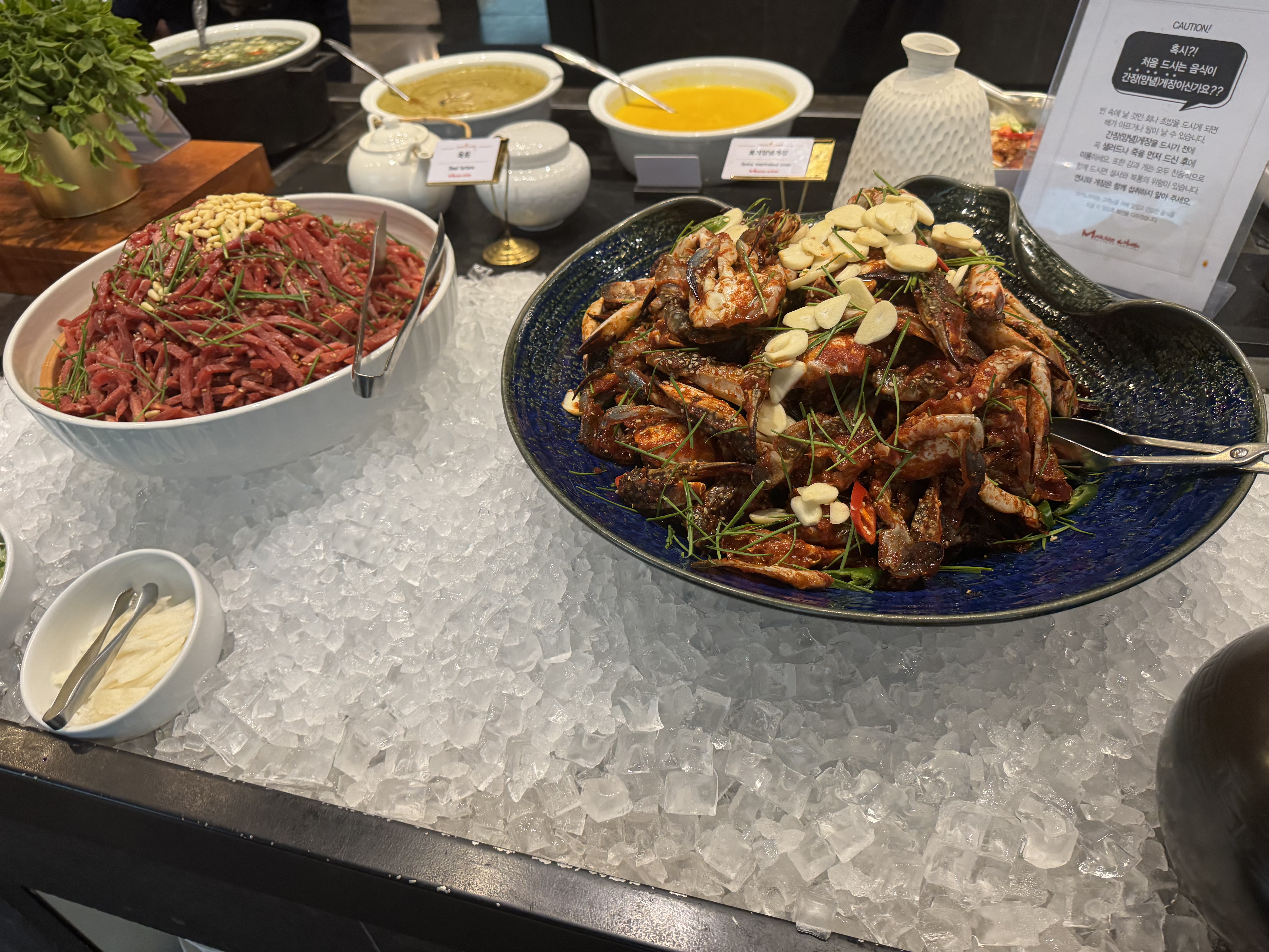 - 밑반찬과 국 : 양념게장, 물김치를 포함한 기본 밑반찬 종류가 매우 풍성하여 어른들도 만족할 만한 구성이었습니다. 국물 요리로는 시원한 꽃게탕과 몸에 좋은 매생이굴탕이 준비되어 있어, 한식으로만 한 끼를 채워도 충분할 정도의 퀄리티였습니다. 한국인의 입맛을 제대로 저격하는 코너였습니다.