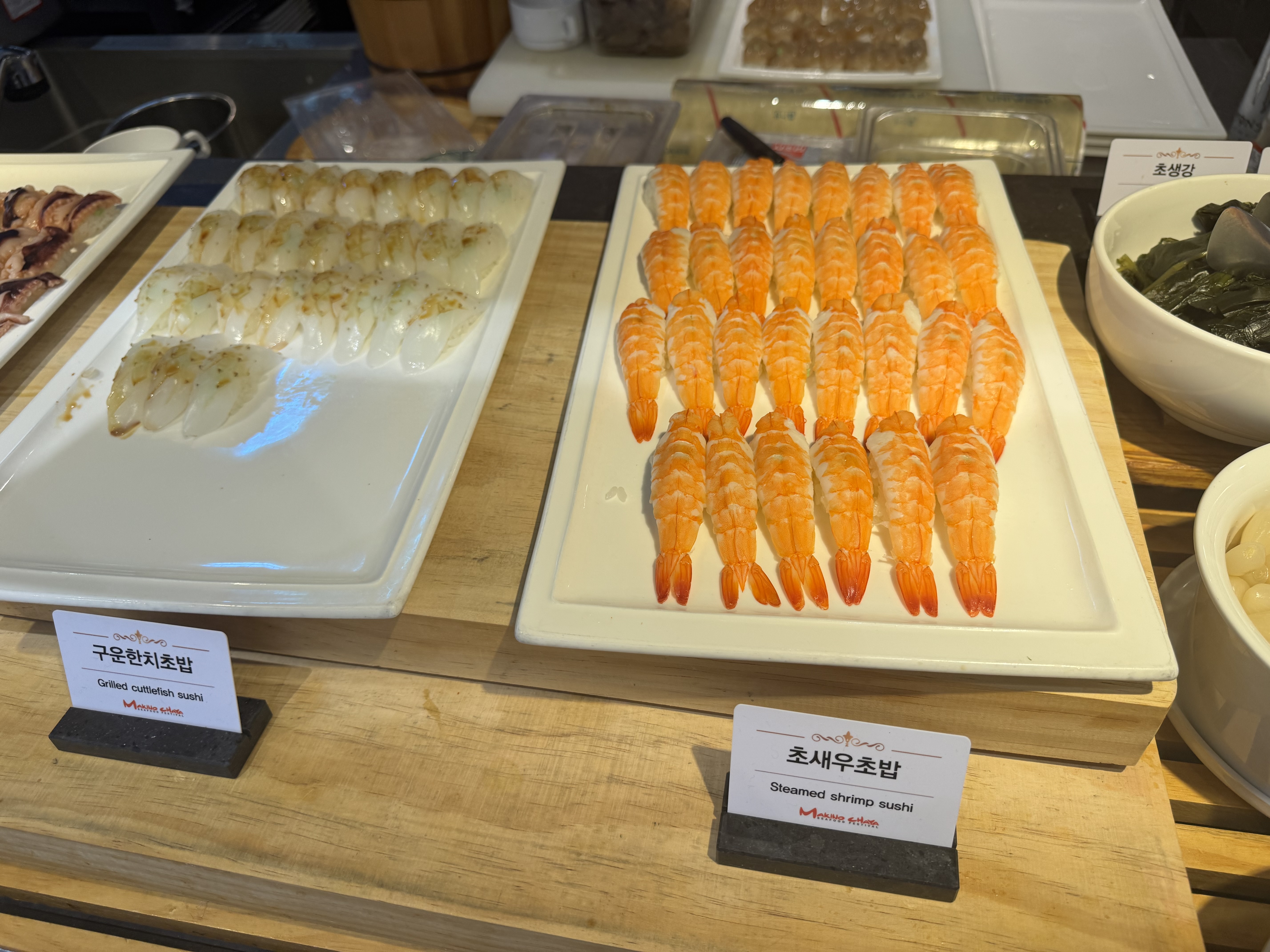 특히 초새우 초밥, 간장새우 초밥, 가리비 초밥, 연어 초밥 등 대중적인 인기가 높은 메뉴들이 준비되어 있었는데, 하나하나 신선도가 느껴져 감탄했습니다. 특히 제가 좋아하는 간장새우 초밥은 탱글탱글하면서도 짭조름한 간장 양념이 잘 배어 있어 몇 접시를 가져다 먹었는지 모릅니다. 연어 초밥도 두툼하게 썰린 연어 덕분에 입안 가득 부드러움이 퍼졌습니다. 마키노차야가 해산물뷔페로 유명한 이류를 이 초밥 존에서부터 확실히 느낄 수 있었습니다 .단순히 구색맞추기가 아니라, 전문 스시집 못지않은 퀄리티를 자랑했습니다.