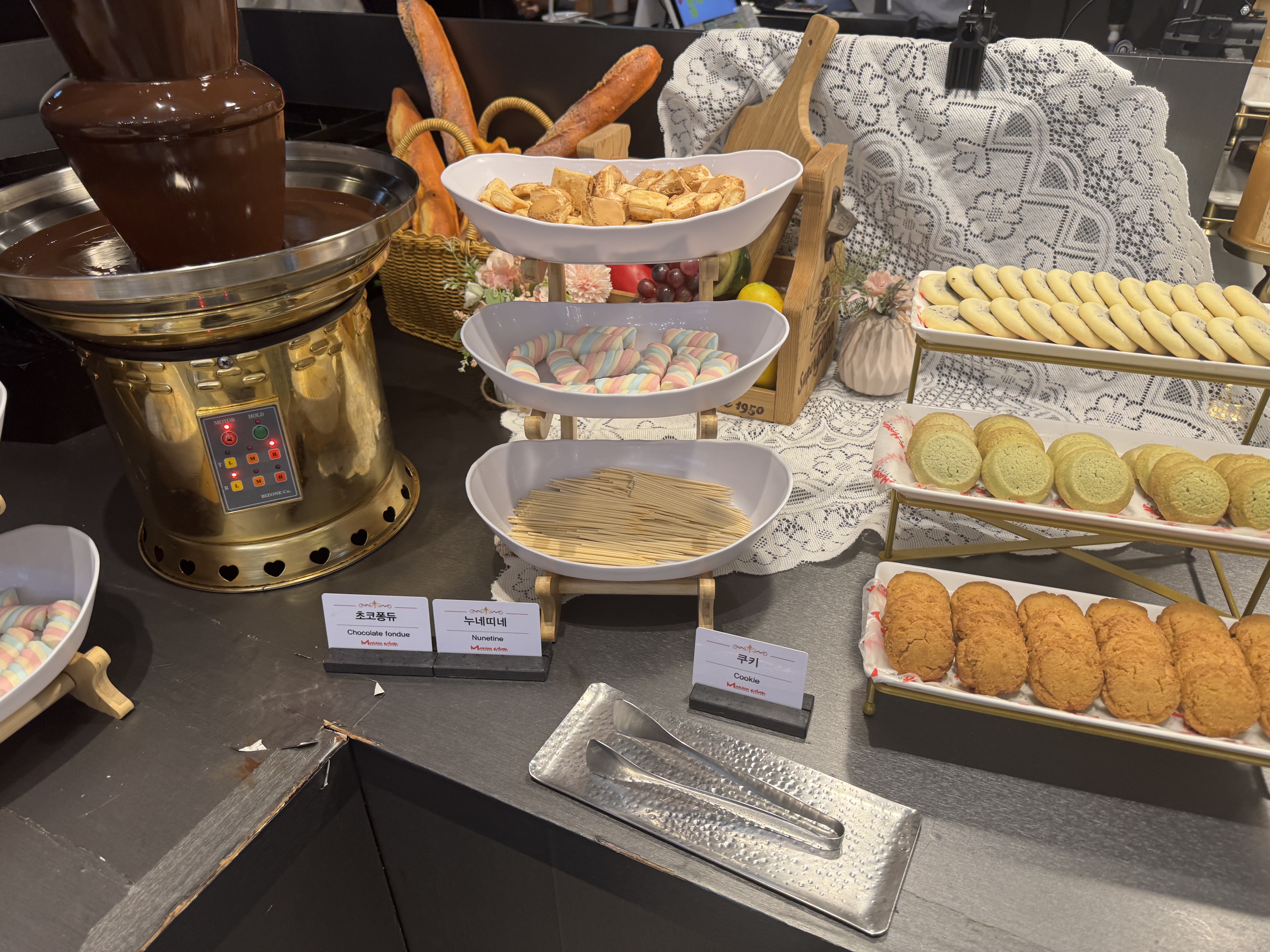 - 빵류 & 과일 : 조각케이크, 타르트, 쿠키 등 각종 빵류가 신선하게 준비되어 있었고, 계절 과일도 당도가 높아 상큼함을 더했습니다.