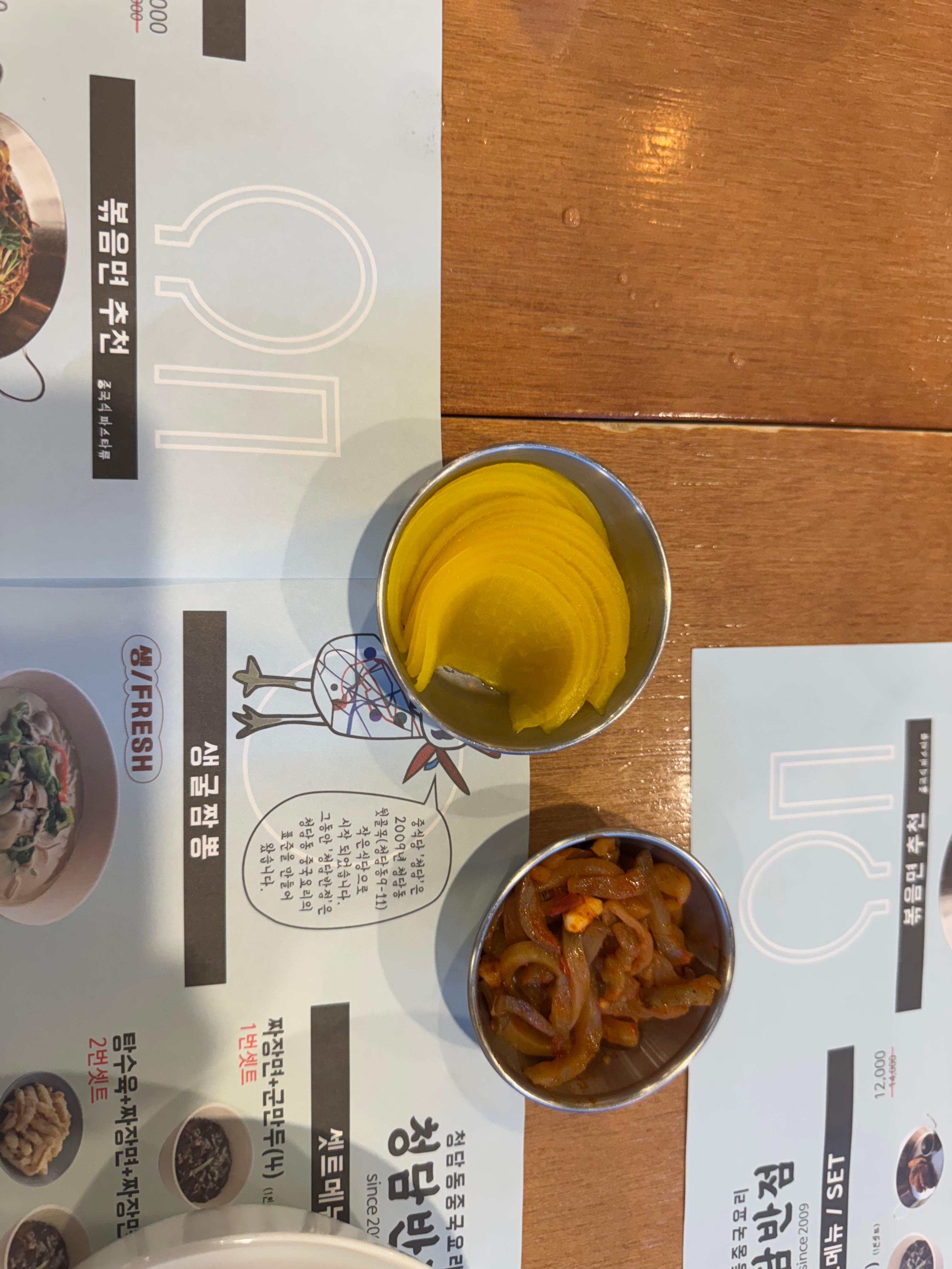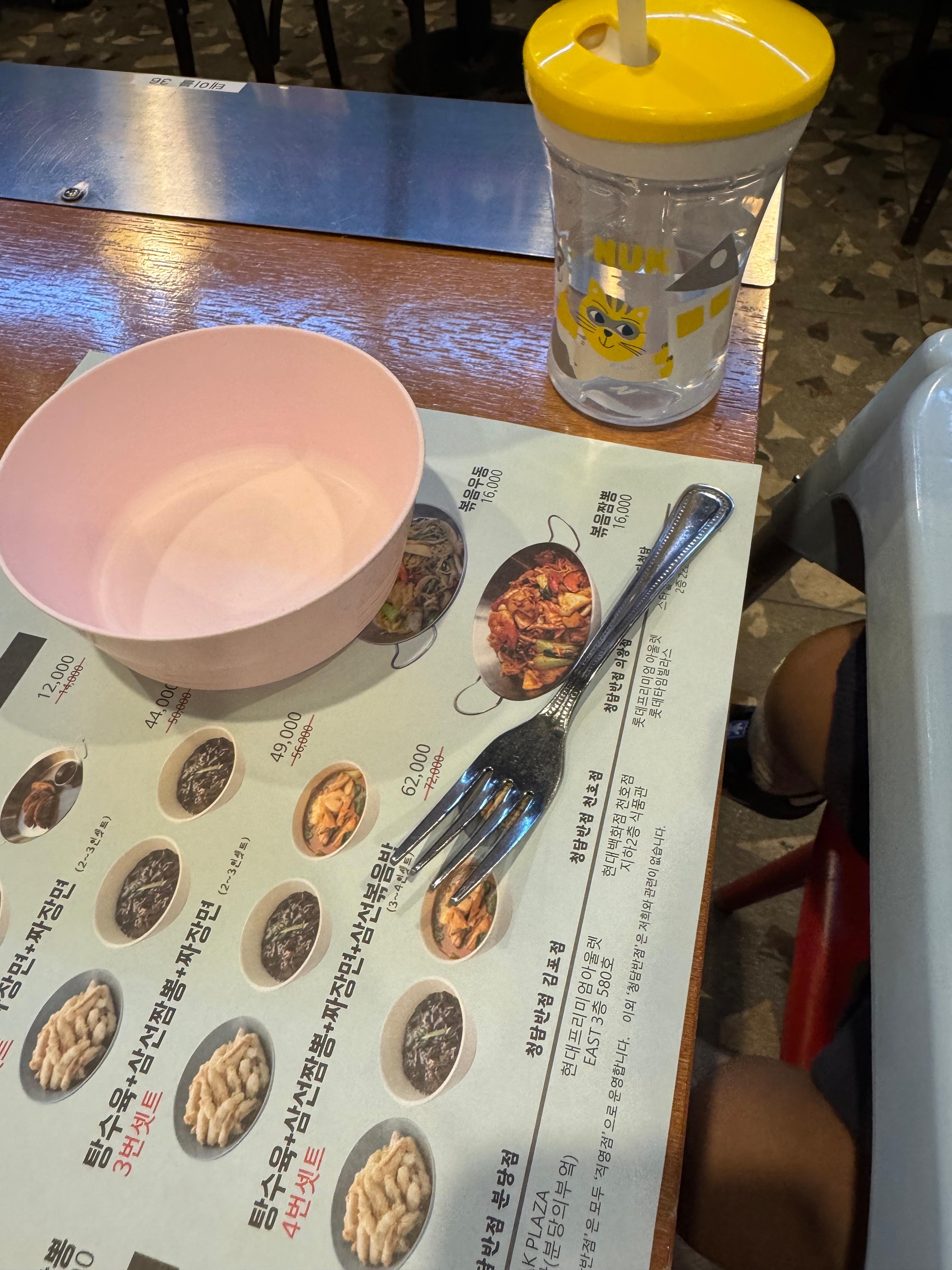 청담반점은 의왕아울렛 1층 푸드코트에 자리 잡고 있어서 접근성이 진짜 좋았습니다. 유모차 끌고 이동하기도 수월했고, 나쪽도 생각보다 넓어서 "아 여기 아기랑 와도 되겠는데?"싶은 느낌이 들었습니다. 자리에 앉마자 아기의자와 아기를 위한 플라스틱 그릇을 줘서 아기를 신경쓰는구나.라는 생각이 들어서 좋았습니다. 그리고 자리에 앉자마자 테이블 위에 메뉴판이 쫙 깔려 있었고, 직원분이 기본 짜사이랑 단무지를 툭 놓고 가셨습니다. 이 부분은 중국집 감성 그대로라 익숙했구요. 아기랑 같이 왔다고 하니까 애기용 그릇도 바로 챙겨주셔서 이건 살짝 감동 포인트였슴다. 이런 부분에서 처음 입장했을 때의 분위기를 좌우한다고 생각합니다.